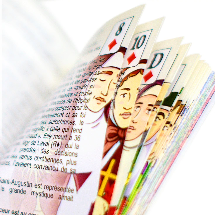 Chaque paquet de cartes est accompagné d’un livret dans lequel une brève histoire de vie est proposée pour chaque figure de sainteté illustrée. Les cartes et le livret sont bilingues (français et anglais).