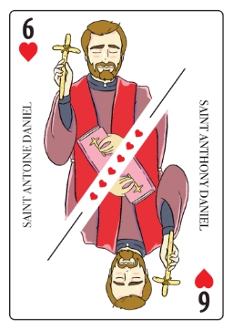 Je m’appelle Mathieu Filion, je vis dans la région de Québec et je suis engagé dans ma foi auprès de l’Église catholique. Après avoir fait un pèlerinage en Europe, il m’est monté au cœur de créer un jeu de cartes avec des Saints. Lorsque j’en ai parlé au Cardinal Gérald Cyprien Lacroix, archevêque de Québec, il m’a encouragé à faire particulièrement connaître les saints liés à l’histoire du Canada. J’ai répondu à l’appel, et avec quelques frères et sœurs dans la foi d’un peu partout dans la Province, nous nous sommes lancés. Après un bon moment de recherche, nous nous sommes assurés auprès de Mgr Serge Poitras, spécialiste canonique du Canada, qu’aucun n’ait été oublié.